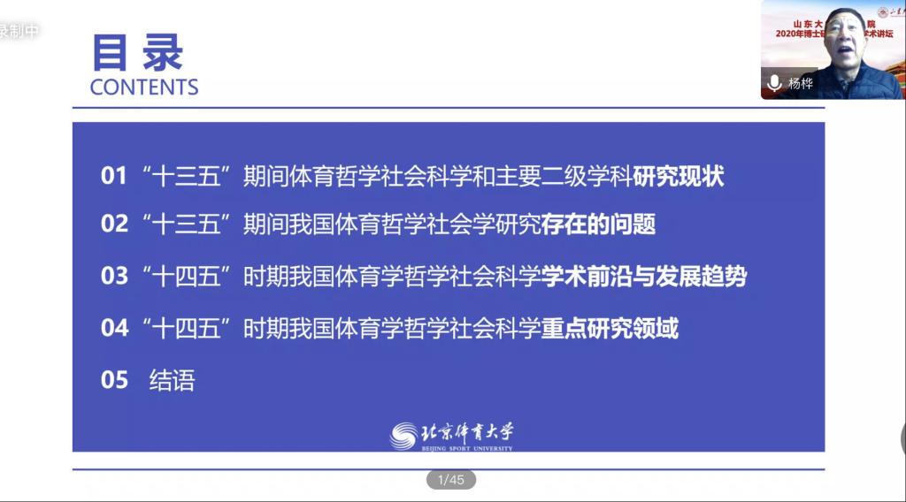 首先,杨桦教授就2016-2020年国家社科和教育部人文社会科学研究课题立项的数量、地区、出版著作和智库建设等方面进行总体介绍。他提出“十三五”期间体育学的二级学科日臻成熟,讲授了体育哲学、体育社会学、体育经济学、体育史学等学科的研究议题与进展,列举了在“十三五”时期取得的重大研究成果。其次,杨桦教授提出在“十三五”期间我国在体育哲学社会学的研究上还存在不足,比如成果转化率、学术原创力和体育学科建设等方面还有问题尚未解决。杨桦教授还对“十四五”时期体育学哲学社会科学将会发展的重点研究领域——国民健康素养与健康促进、健康中国建设与体育强国建设中的法律保障、健康中国和体育强国建设中体育的多元功能与价值等方面进行了详细地讲解。最后,杨桦教授全面概括了“十三五”时期体育学在国家哲学社会科学基金中的发展,为“十四五”时期体育学的建设和发展表明了方向。讲座结束后,参会师生就“十四五”期间在国家从全面建成小康社会到全面建设社会主义现代化国家背景下体育学科的走向、后疫情时代体育产业未来发展、体教融合以及体育文化繁荣与发展等问题进行交流。杨桦教授都耐心地对每个问题作出了详细的解答,现场交流气氛十分热烈。