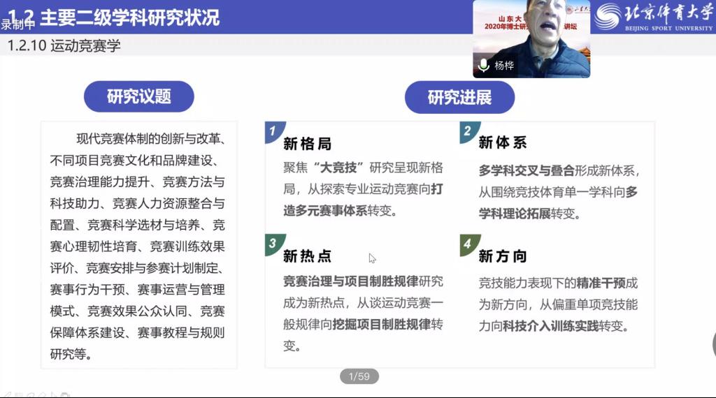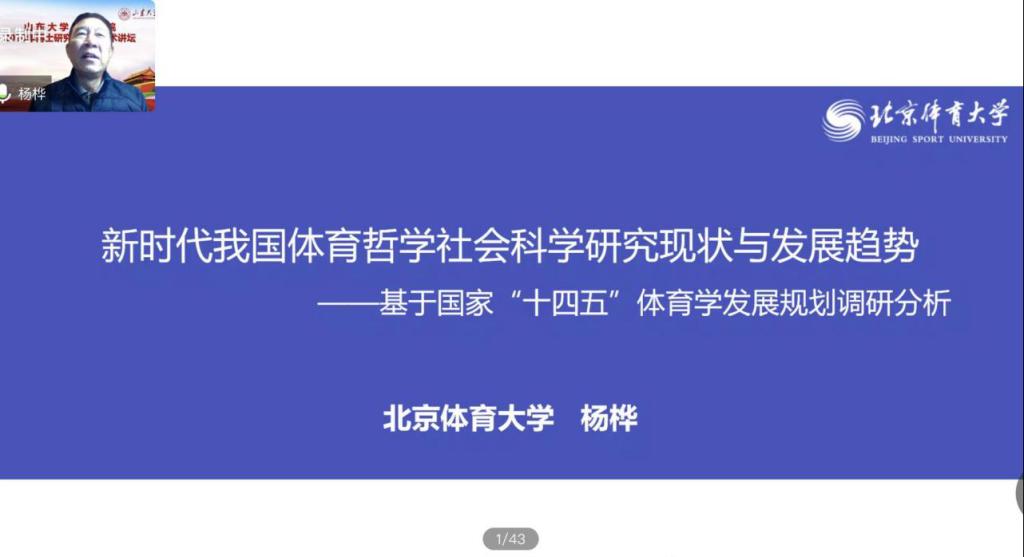 11月3日,2020年度太阳成集团tyc33455cc“博士研究生高端学术讲坛”顺利召开。第一场学术讲座邀请到原北京体育大学书记、 校长、博士生导师杨桦教授担任本次讲坛主讲嘉宾。通过腾讯会议,杨桦教授以“新时代我国体育哲学社会科学研究现状与发展趋势——基于国家‘十四五’体育学发展规划调研分析”为主题进行分享。讲坛由太阳成集团tyc33455cc党委书记、院长孙晋海主持。