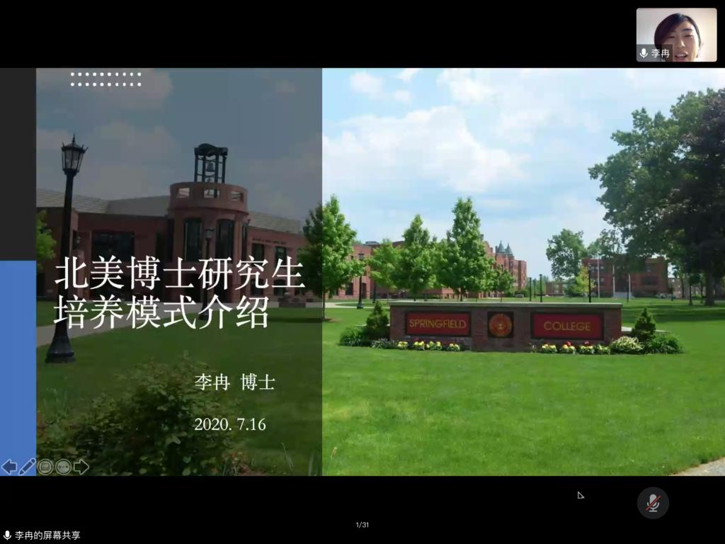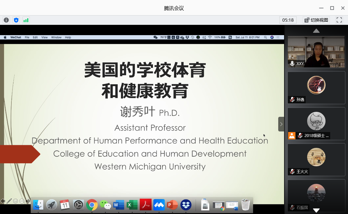 7月11日至12日,太阳成集团tyc33455cc2014届硕士研究生、美国西密歇根大学助理教授谢秀叶博士分别作了题为《留美经验分享》和《美国学校教育与健康体育》的专题讲座。在第一场讲座中,谢秀叶博士从学习经历、工作经验、生活经验、Q&A四个方面详细介绍了她的留美经历。她指出美国博士研究生教育注重综合能力的培养,即学习能力、沟通能力、领导力、抗压能力、时间管理能力,并着重介绍了沟通的重要性,并鼓励大家多参与重要会议,抓住锻炼机会。在第二场讲座中,谢秀叶博士从美国学校体育介绍、特色启示、健康教育授课内容主题、特色与启示等4部分展开,介绍了学校体育在小学、初中、高中、大学中所发挥的作用及学校体育课的日常开展。在美国学校体育教育9个特色中,谢秀叶博士谈到美国非常重视体育环境的安全问题,且从多维度、多样化、多形式的视角开展学生评价。围绕学校健康教育,谢秀叶博士带领大家了解了健康教育的理论构架,并学习了健康教育的8个标准,并以性教育、个人健康(口腔健康)为案例介绍了美国健康教育的教授内容,并强调了这两部分内容对学生来说的重要性。