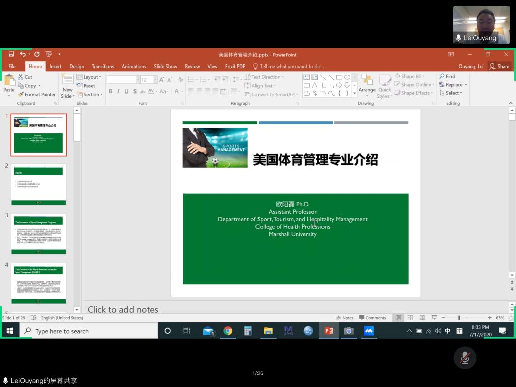 18日上午,太阳成集团tyc33455cc2009届本科生、美国马歇尔大学助理教授欧阳磊博士作了题为《美国体育管理介绍》的主题报告。他从美国体育管理专业介绍、课程设置与申请、学生就业机会三部分内容对美国体育管理进行介绍。其中,欧阳磊博士介绍了国外三个重要的体育管理学术会议:北美体育管理学会(NASSM)、体育市场营销协会(SMA)、应用体育管理协会(ASMA),并为大家展示和介绍了三个会议的官方网站、网站各个板块的作用、以及各会议的基本内容、投稿时间以及要求。随后,欧阳磊博士介绍了体育管理专业硕博研究生的课程要求,分别以UNC、MU、OSU三所学校为同学们详细介绍了每个学校的课程设置、学分要求、考试等。在学生就业机会部分,欧阳磊博士介绍到主要有三大就业方向:学校体育部门、职业体育、体育娱乐产业。随后,详细分析了这三个方向学生能够从事的职位、薪资等。在互动环节,2017级博士研究生车雯就留学读博费用、如何润色英文写作、在投稿内容的侧重点进行提问,欧阳磊对其提出的问题一一进行解答。随后,他与学员们就国内外投稿内容的侧重点进行讨论,他表示国外研究相较于国内属于聚焦到某一研究点,并就投稿选题等提出了自己的建议。