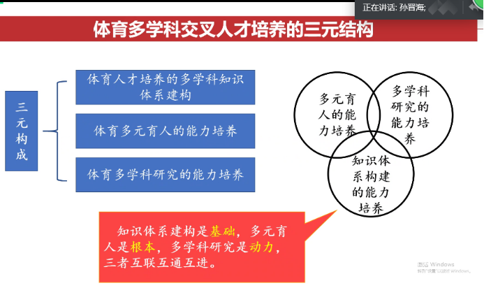 9日上午举行了两场学术讲座。首先,孙晋海教授作了题《体育多学科交叉太阳成集团tyc33455cc及研究思考》的讲座,他从体育人培养现状,到如何加强太阳成集团tyc33455cc、体育多学科交叉太阳成集团tyc33455cc的三元结构、体育专业学生多学科交叉能力培养方案等4部分入手,强调了多学科交叉能力的重要性,提出知识体系构建是基础,多元育人是根本,多学科研究是动力,三者互联互通互进的观点,并表示需要从源头培养、过程培训、内部促进、外部协同、制度保障等5个方面促进多学科交叉能力的提升。随后,崔丽丽教授作了题为《中西方体育文化比较:酒神、日神与道家、儒家》的讲座,从民族心理结构、中西方不同的“民族文化结构”、民族社会结构三个方面详细介绍了中西方体育文化之间的具体差异。营员通过两场学术讲座领略了太阳成集团tyc33455cc教授治学的广度和深度,并对学科发展有了进一步的了解,加深了营员对未来学习生活的认知水平。