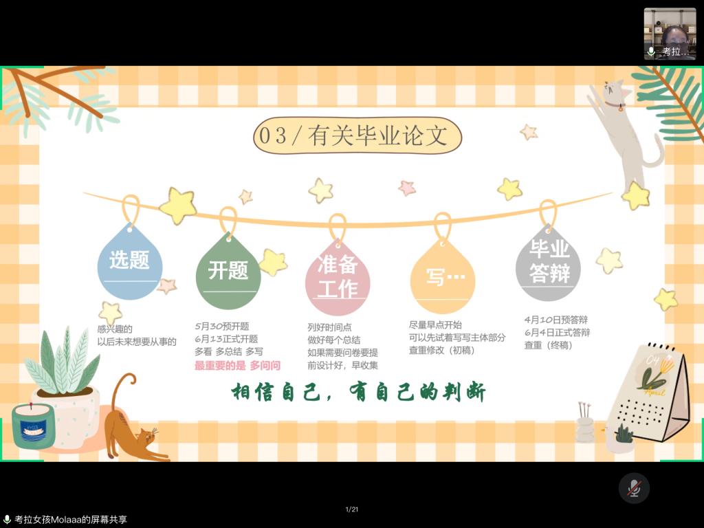 榜样的力量是无穷的!毕业生同学积极向上、倾囊相授的经验分享,为低年级同学未来的学习生活增强了信心、树立了目标,提供了不可或缺的帮助。无容置疑,本年度的经验分享会进一步增进了同学之间友谊,增强了毕业生对学院、学校的情感。盛夏花怒放,青春不散场,祝愿毕业生在特殊时期能够乘风破浪,前途似海。