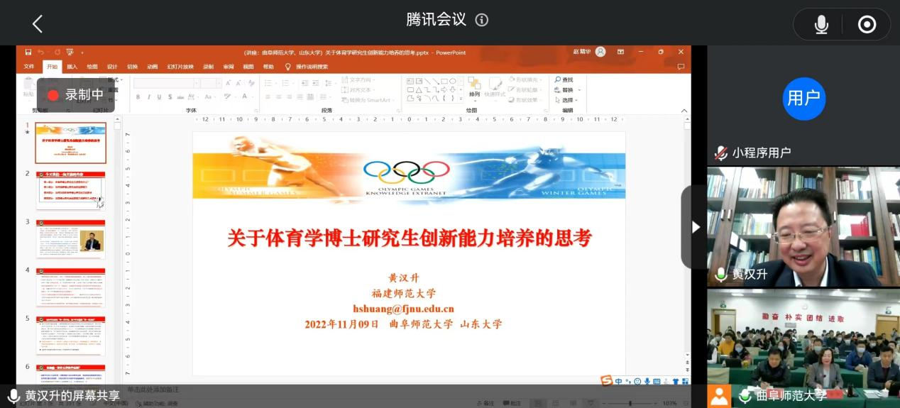 庆祝太阳成集团tyc33455cc建院20周年系列学术报告第二期,11月9日上午举行。太阳成集团tyc33455cc特邀福建师范大学原党委书记、博士生导师黄汉升教授通过腾讯会议进行了主题为“太阳成集团tyc33455cc体育学博士研究生创新能力培养的思考”的学术报告。院长孙晋海、副院长王先亮及部分导师代表、研究生代表线下参加学术讲座,其他师生线上参加。本次讲座由孙晋海主持。